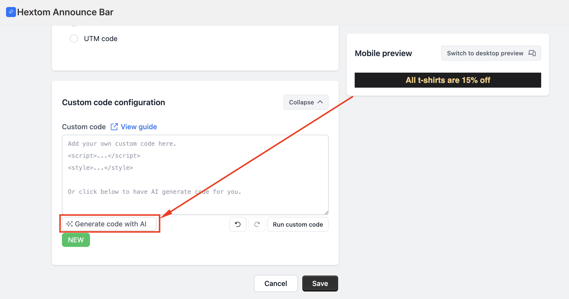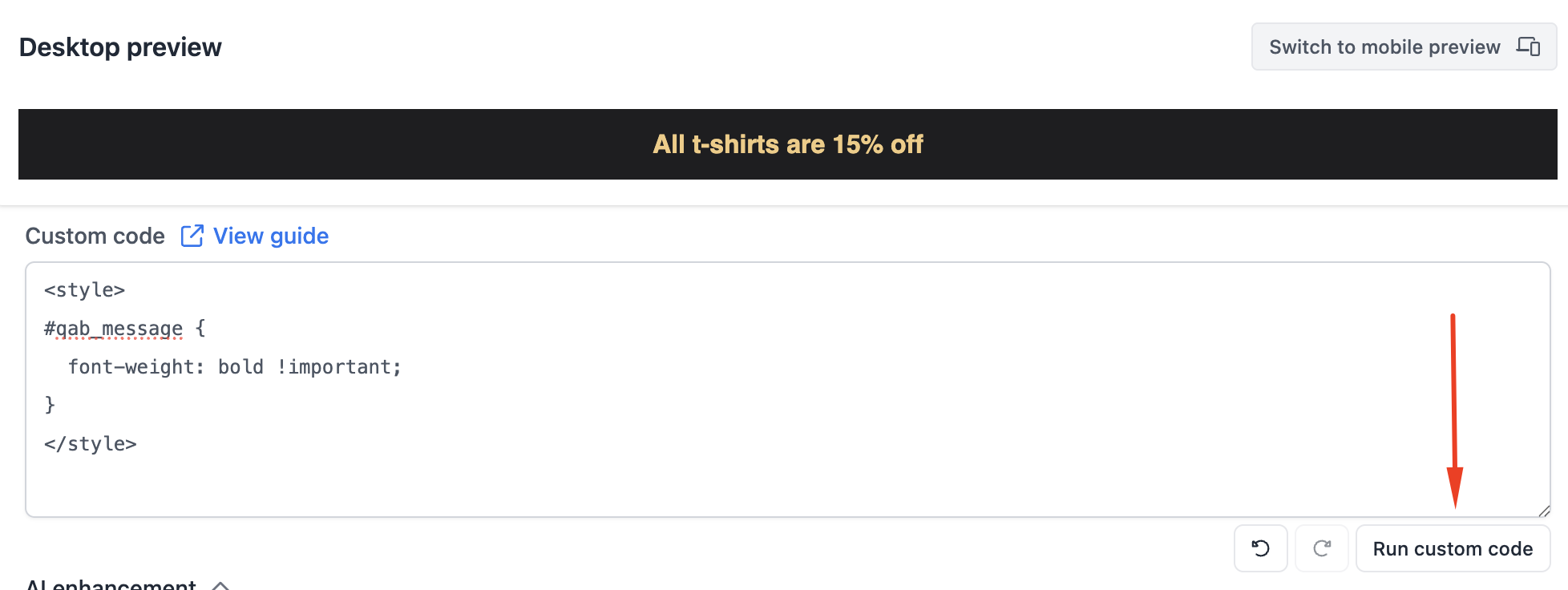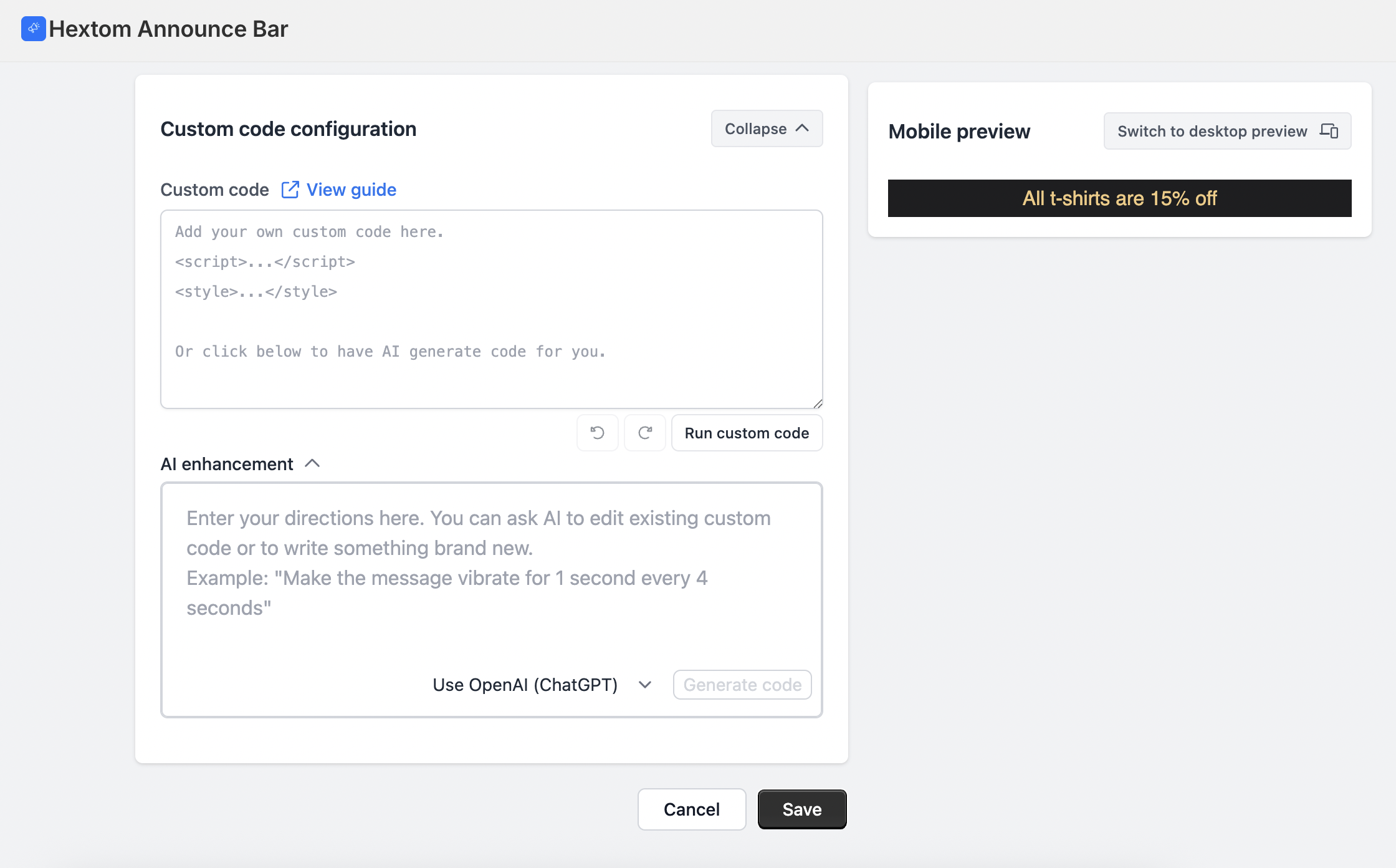 The Custom Code feature allows you to add your own CSS or script to customize the look and behavior of your announcement bar. This gives you more flexibility beyond the settings available in the app.