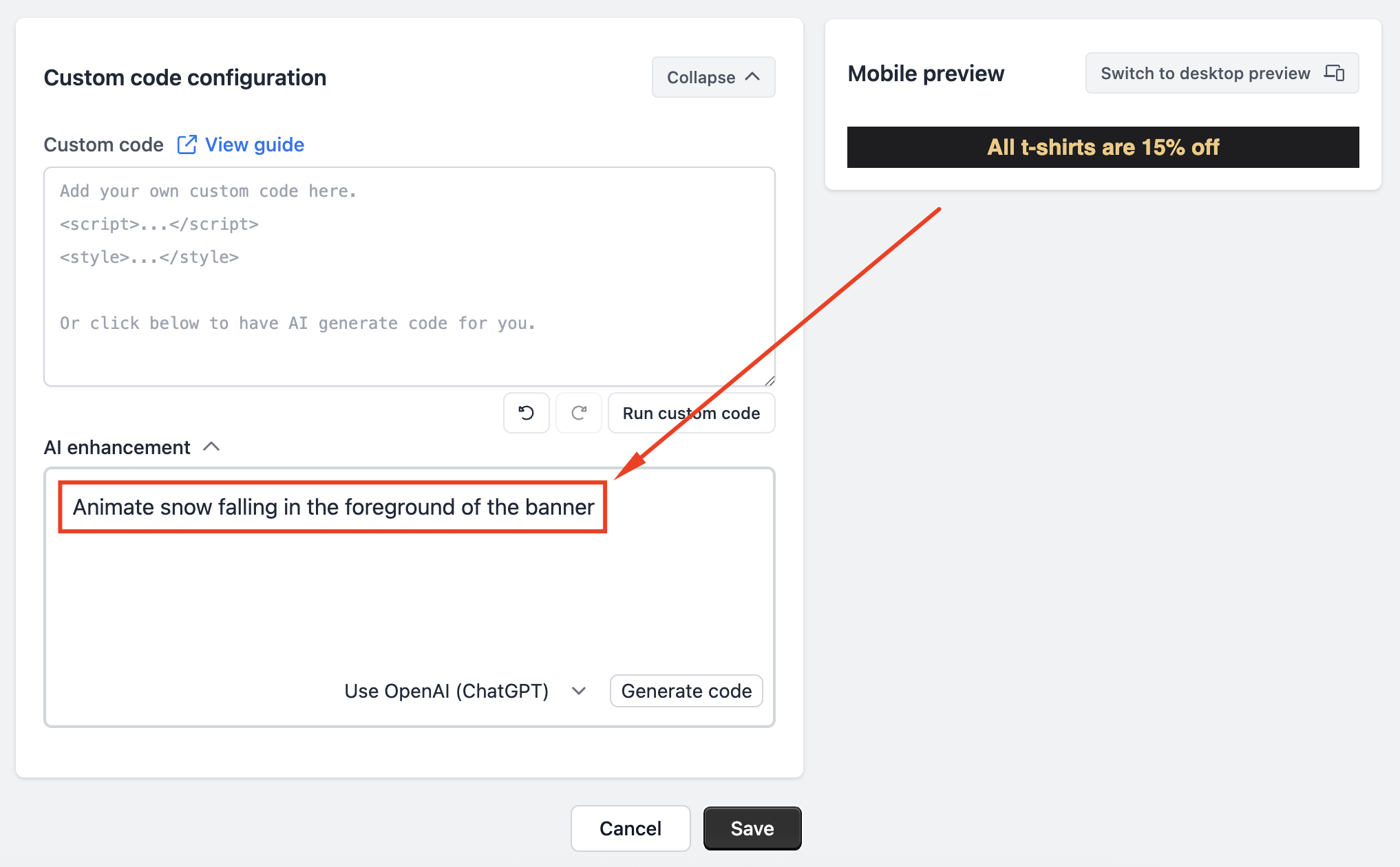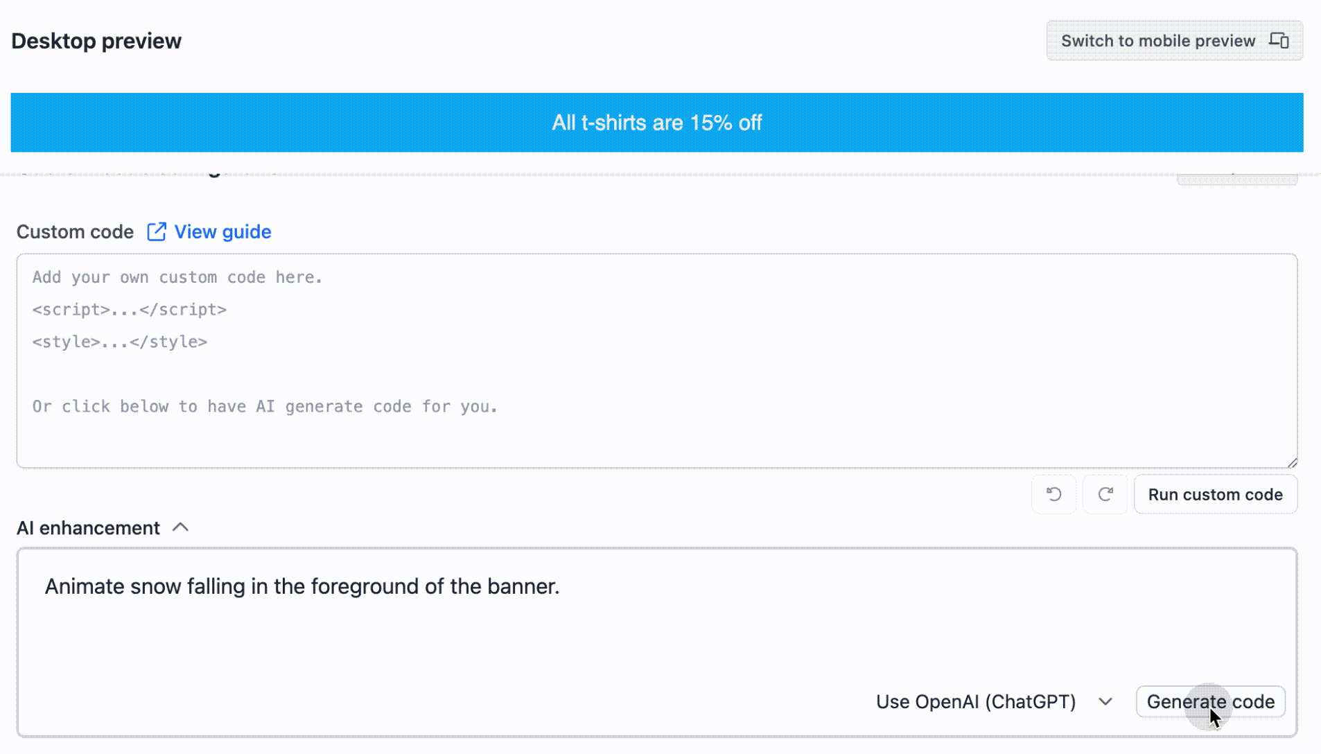 Type what you want to achieve in the text area that appears (for example: "Animate snow falling in the foreground of the banner").