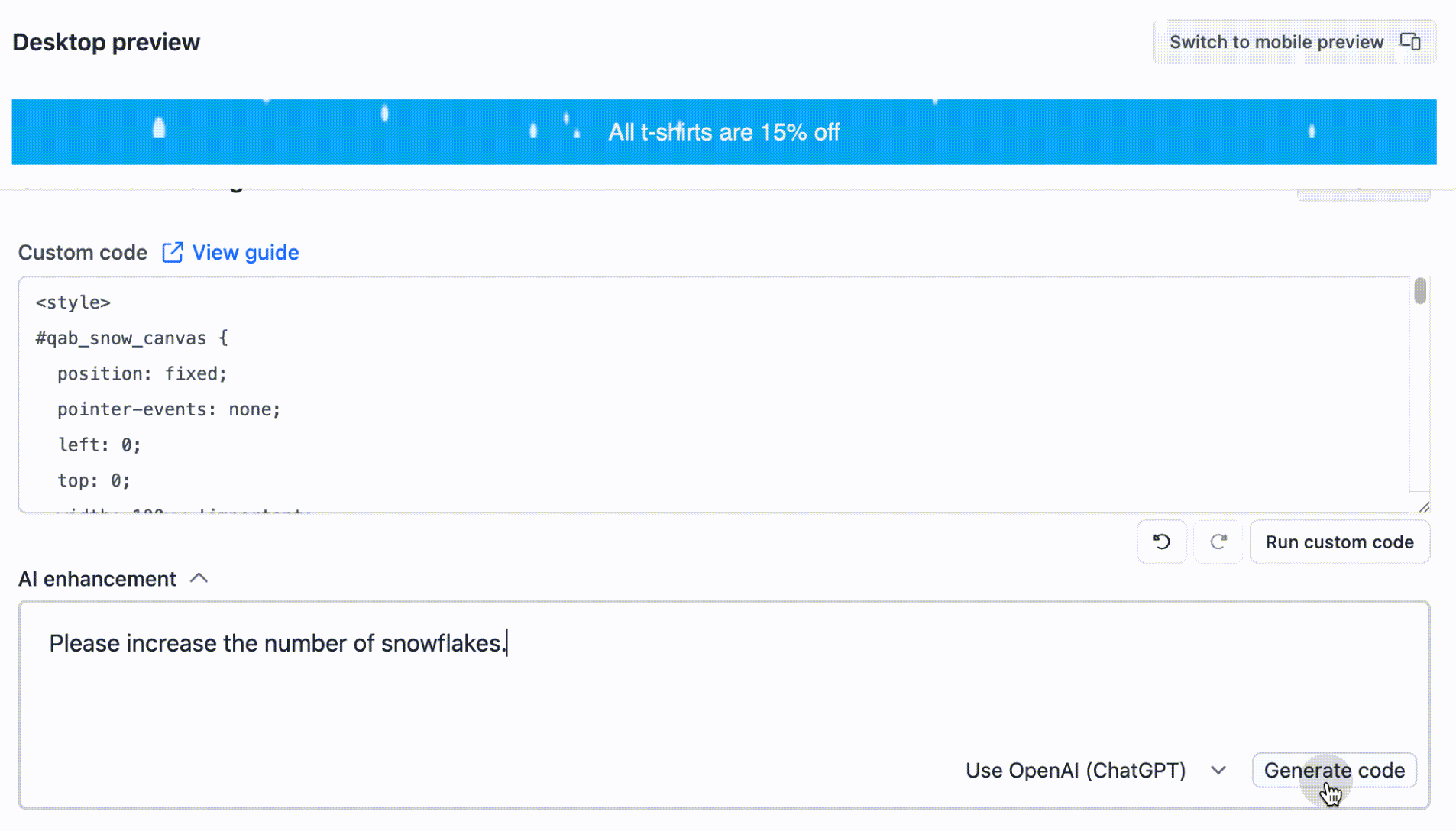 - Enter a new prompt (example: "Please increase the number of snowflakes.") while keeping the existing code in the box