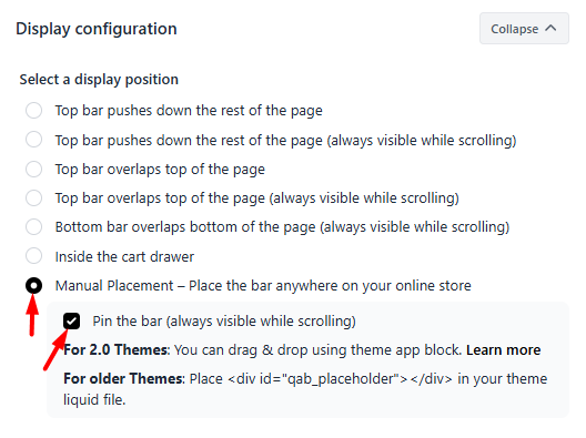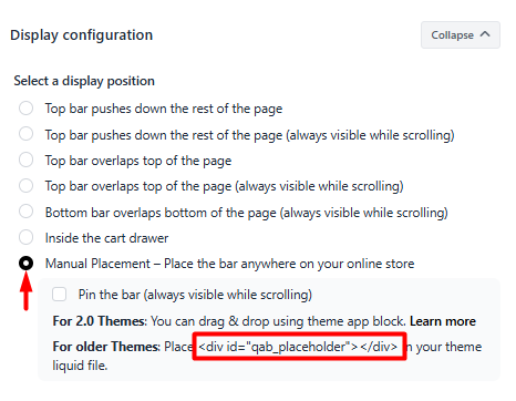 - Use our Manual Placement Feature – This allows you to position bars from different apps at the top of your store. You can do this in two ways: