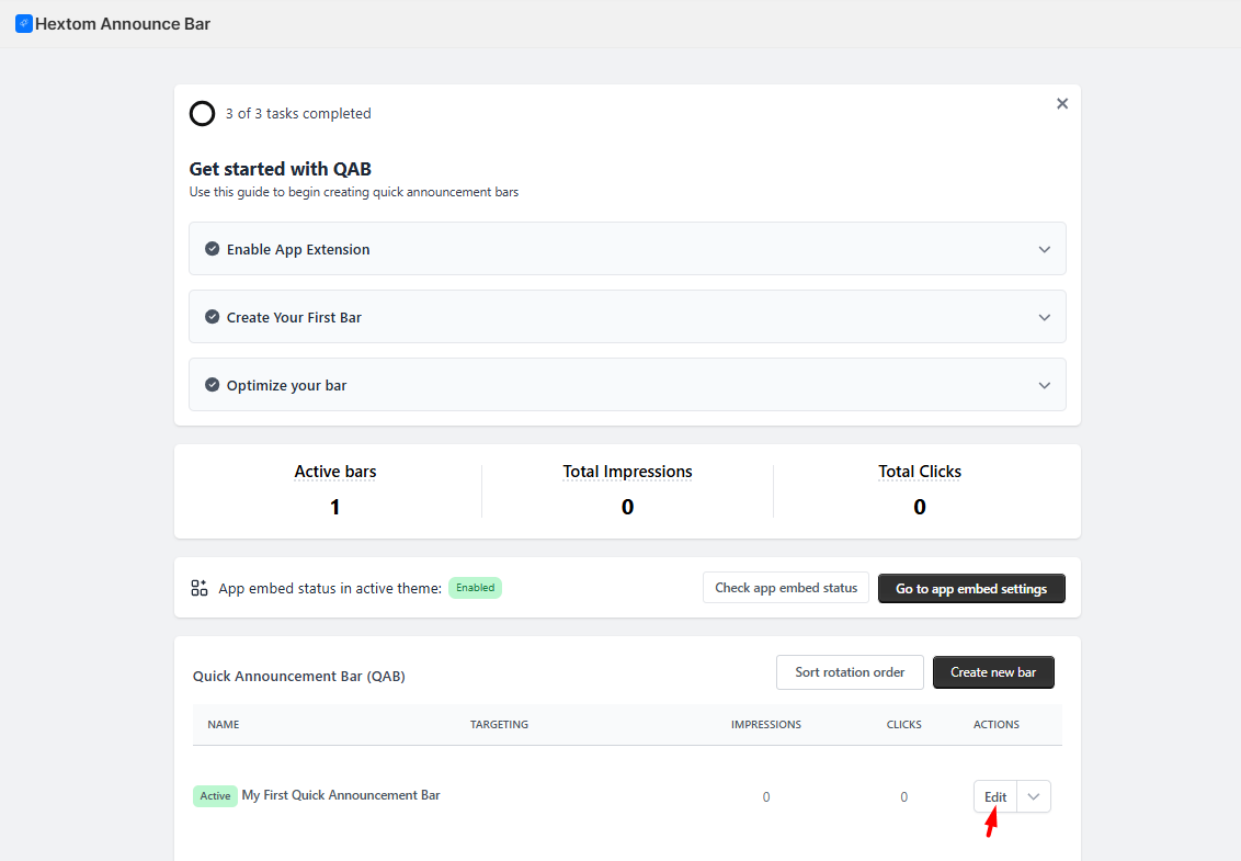 - Go to Quick Announcement Bar app and then click Edit on the bar you want to configure.