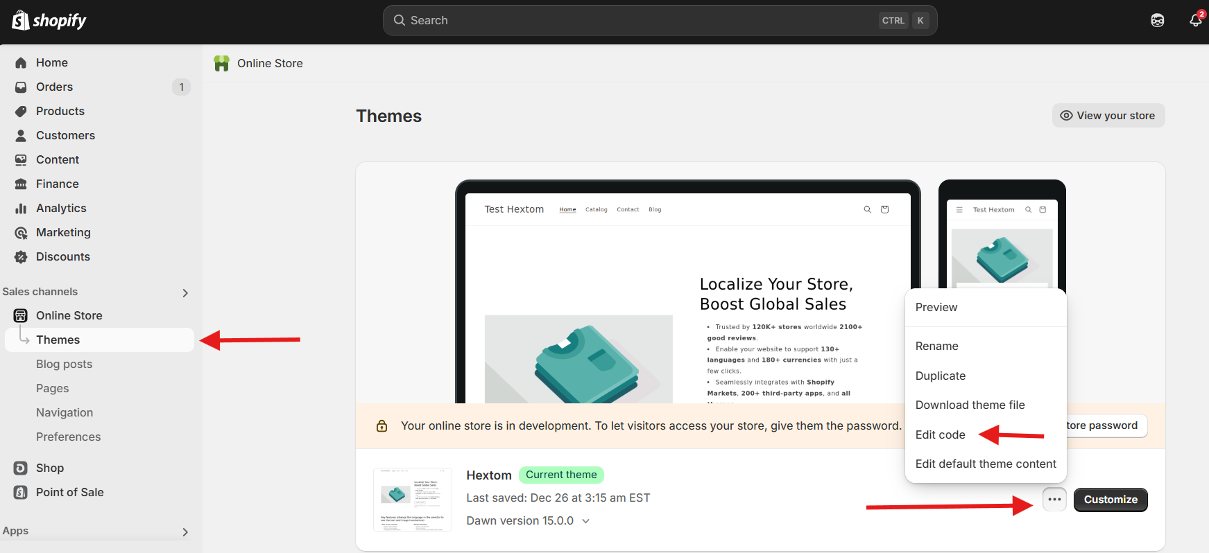- Click the 3 dots > Edit Code on the theme you want to edit.